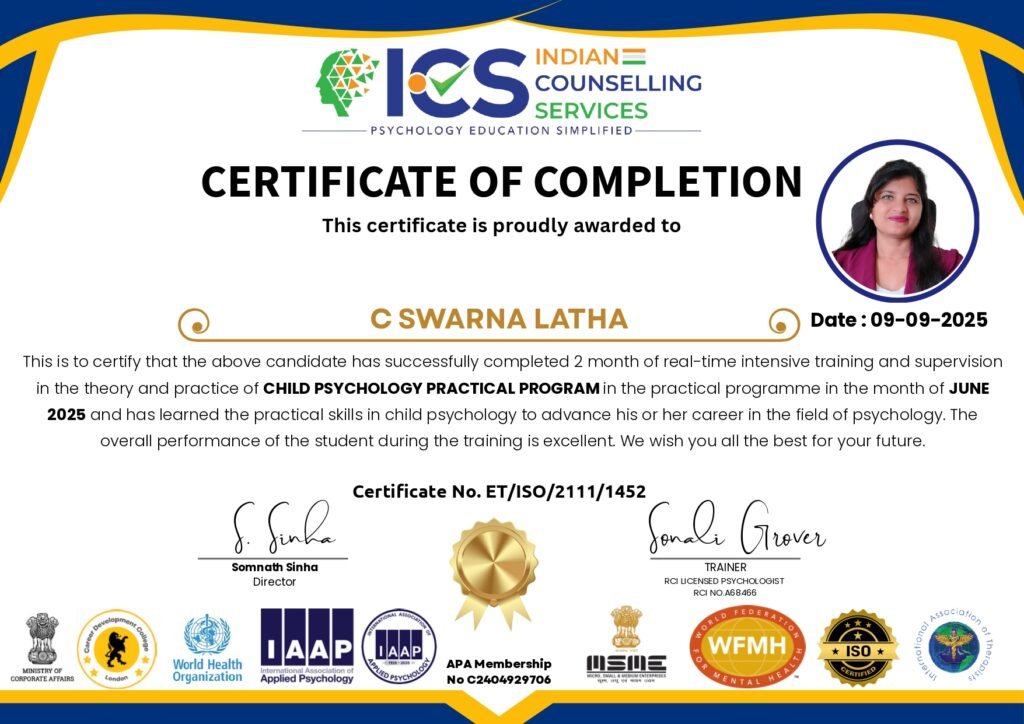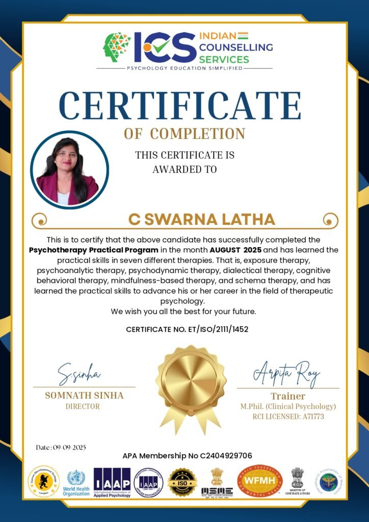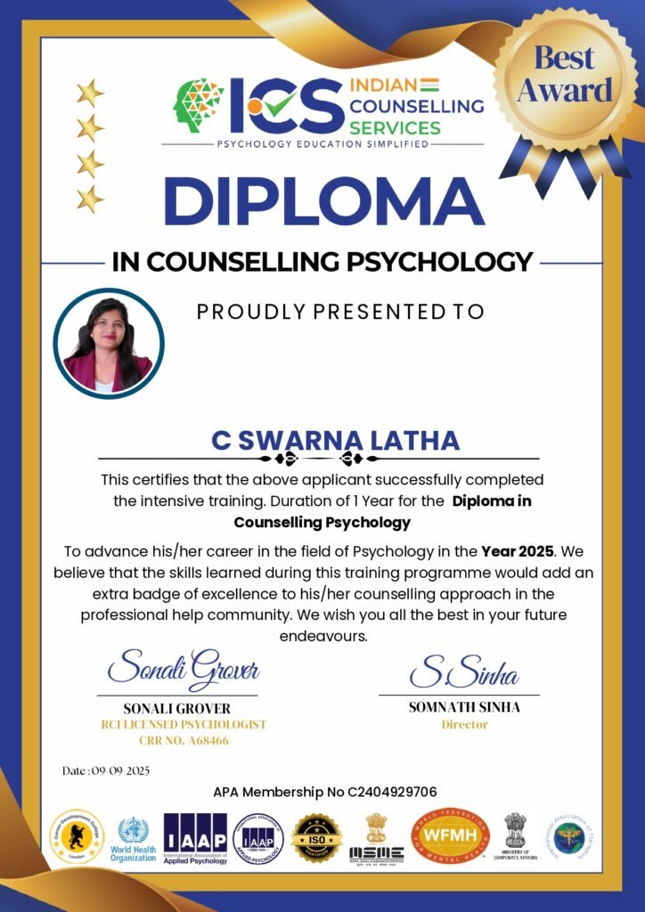 I am Swarna Latha, a certified Life Coach and diploma holder in Counselling Psychology from a